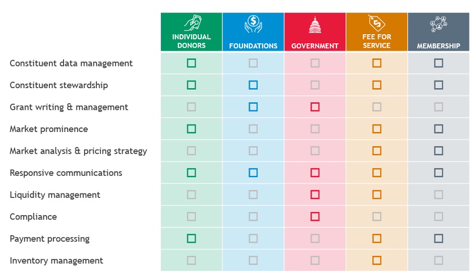 While a few nonprofits rely exclusively on a single type of funding, most have one predominant revenue stream that largely drives their characteristics for success. We see five basic categories of business models among nonprofits, which for a given nonprofit should be analyzed in order of the proportionate ratio of dollars in play: