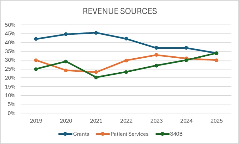 The Coastal Family Health Center (CFHC) decided around ten years ago that it wanted to reduce its reliance on any one revenue source — in particular, on direct grants from the federal government — so it looked to create a more equalized mix between grants, patient fees, and the pharmacy program (340B). Note that these changes were backed by a strategic plan that allowed for a runway sufficient to the task.