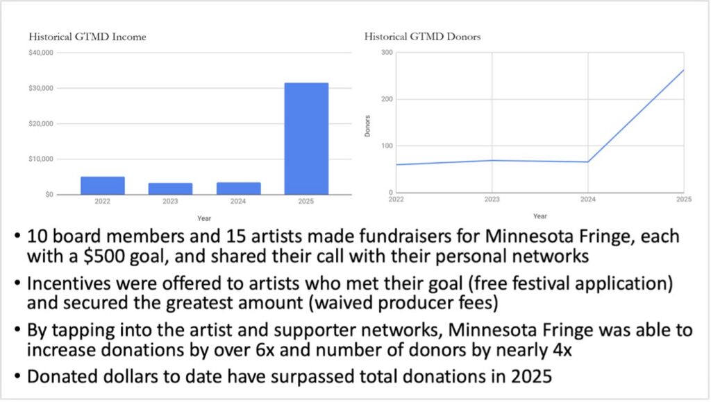 The picture is different in scale but not intensity at the Minnesota Fringe Festival (MFF). After a few years of adjusting to the lingering market effects of the pandemic, MFF lost federal grants for 2026 and had to move fast to at least partly fill the hole in its relatively modest budget. This led to board/staff discussions regarding the leverage points in its business model.