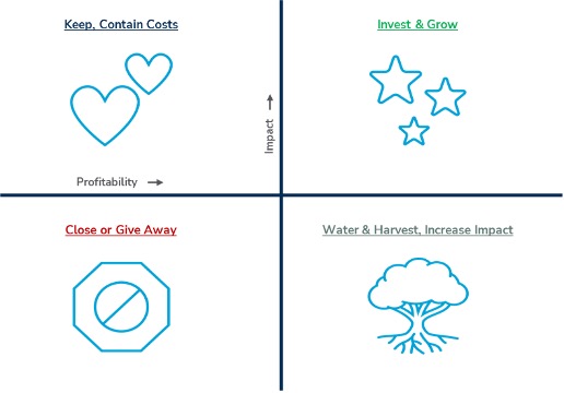 - Perform a cost center mission/impact analysis. This will let you comprehend how your programs contribute to mission impact and financial margin. See attached tool.